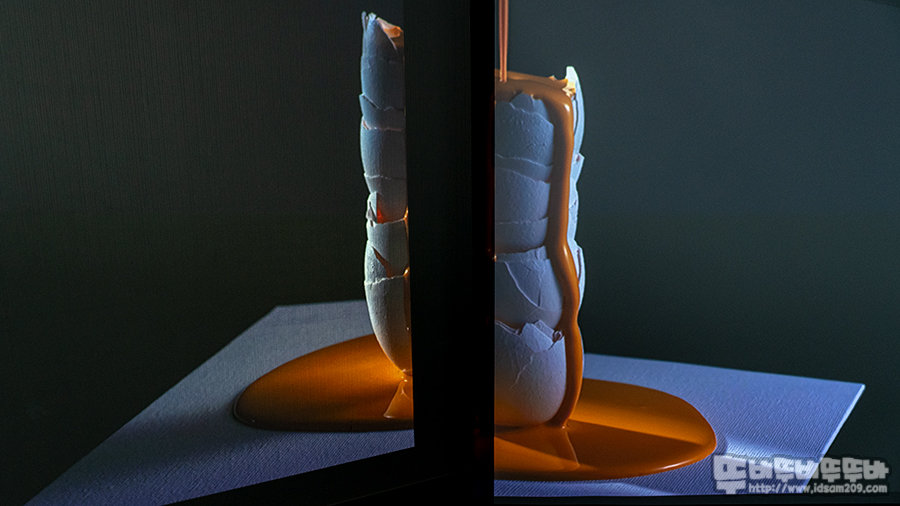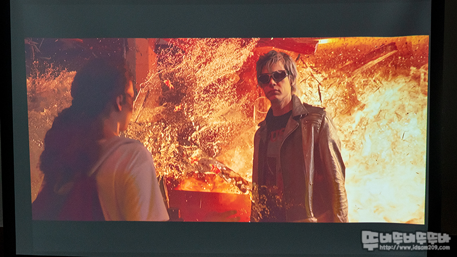 늦은 오후에 테스트하다 보니 스크린 성능이 살짝 덜한 느낌이 있습니다. 하지만, 프로젝터의 밝기와 해상력 등 소스 기기의 성능에 따라 보이는 느낌이 다를 거 같습니다.