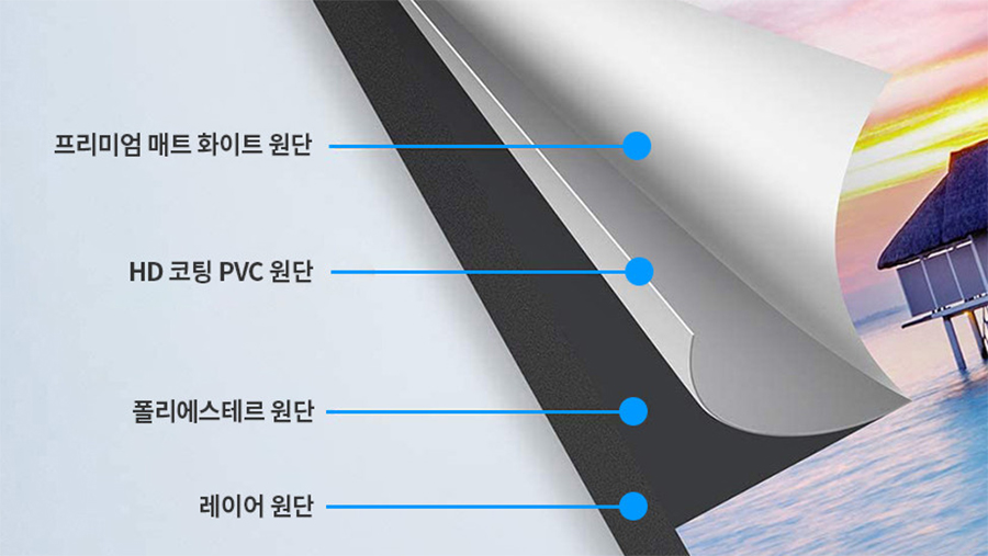 스크린은 4중 원단을 사용하였는데 그중 HD 코팅 PVC 원단과 프리미엄 매트 화이트 원단으로 1.4배 증가하는 선명도와 명확한 색재현으로 178도 시야각에서도 시청이 가능합니다.