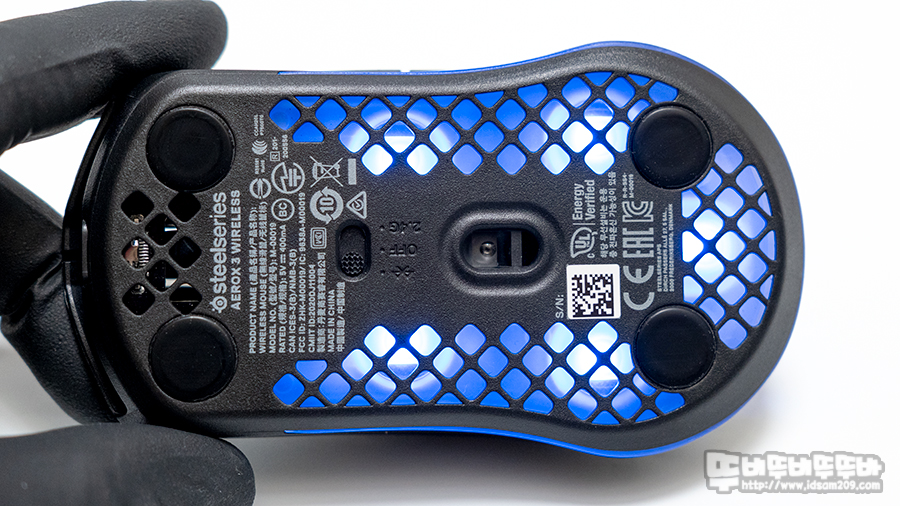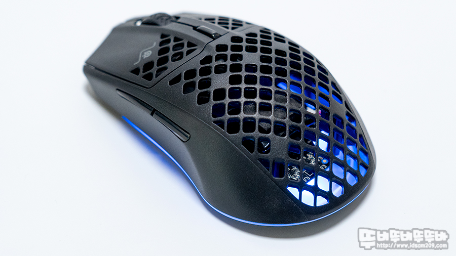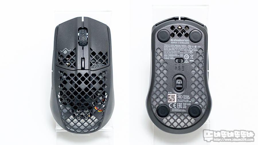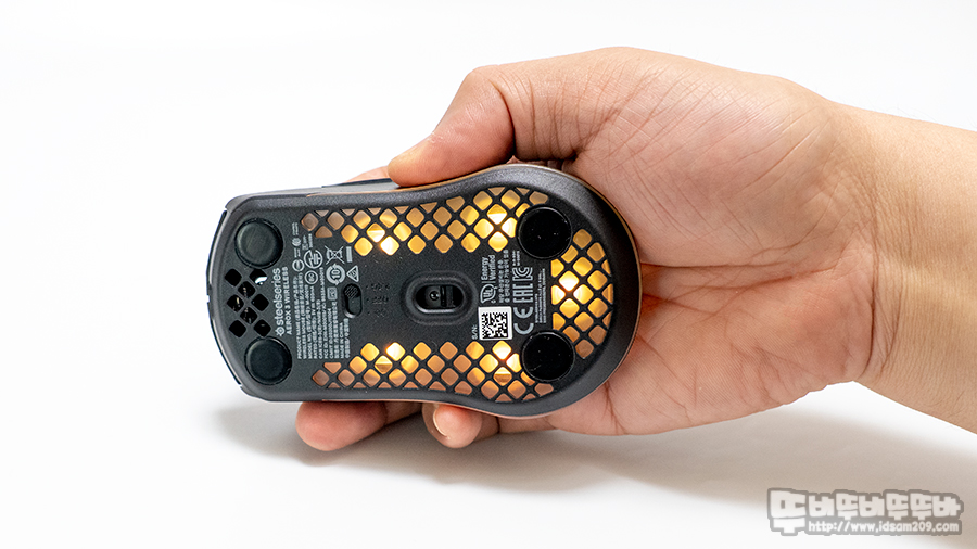 솔리드 하우징으로 구성된 라이벌 3 무선과 다르게 마우스 상판과 하판을 타공 처리하여 무게감을 줄이고 있으며 하판 부분에는 LED 확산을 위한 디퓨저 디자인 적용하여 바닥면을 메우고 있습니다.