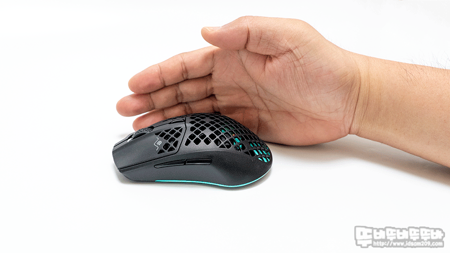 센세이 310의 마우스 크기와 좌우 폭의 그립감이 꽉 차는 느낌이지만 그에 비하면 AEROX 3 무선 마우스는 좌/우 폭이 좁아 손가락으로 많이 움켜쥐어야 하네요.