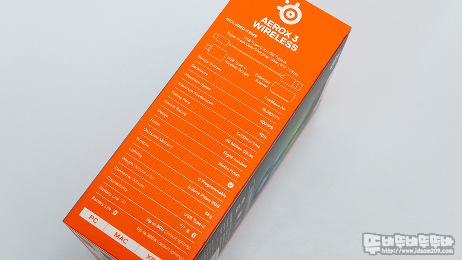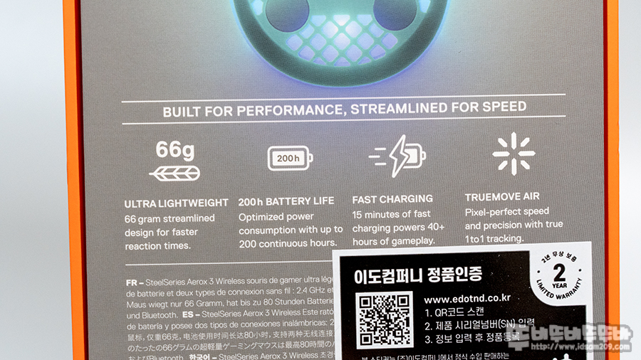 대부분의 RF 2.4GHz 무선과 블루투스 무선 방식을 겸용으로 사용하는 경우 블루투스 사용 시 배터리 타임이 긴 게 특징인데 AEROX 3 무선 마우스를 RF 2.4GHz 무선으로 사용 시 최대 200시간 사용이 가능하며 15분 충전 시 40시간 사용이 가능한 퀵 차징을 지원하고 있습니다.