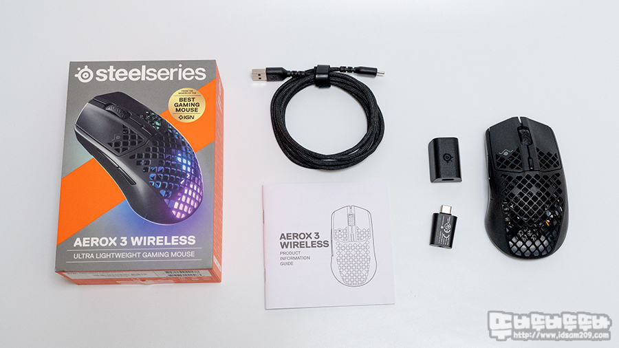 제품의 구성품으로는 USB-C to A 충전 및 리시버 연장 케이블, USB-C to C 리시버 아답터, 무선 리시버, 사용 설명서, AEROX 3 무선 마우스 본체로 구성되어있습니다.