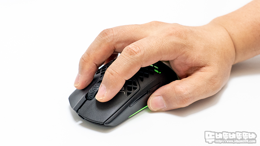 하우징 디자인은 대칭형 구조로 핑거 그립과 클로우 그립에 적합한 사이즈로 크기가 작게 디자인되었기에 팜그립을 사용하기 위해서는 많이 움켜쥐어야 합니다.