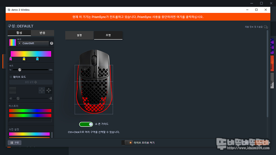 위의 LED 효과 설명에서 사진으로 촬영한 LED 위치에 맞게 3개의 LED 존을 구분하고 있어 3개의 존을 구분하여 LED 효과를 선택할 수 있는데.... 필자는 키보드 클릭, 마우스 클릭 시 자동으로 변경되는 ColorShift를 사용합니다.