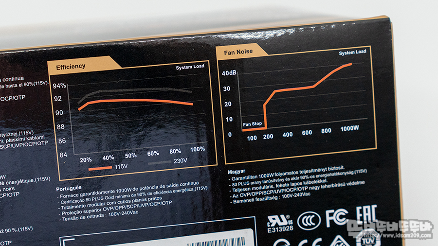 80Plus Gold 등급 도표에서는 115V 로드율 20%-50%-100% 값이 (87%-90%-87%), 230V 로드율은 (90%-92%-89%)으로 50% 로드 시 90% 이상의 효율을 보여주는 정보와 200W 이하에서는 작동하는 제로팬 기능에 대한 내용을 확인할 수 있고요.