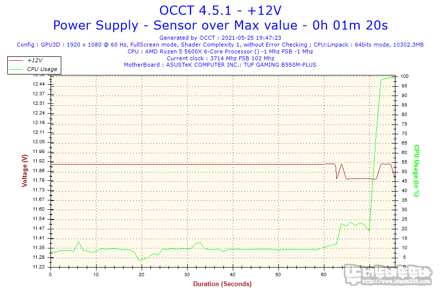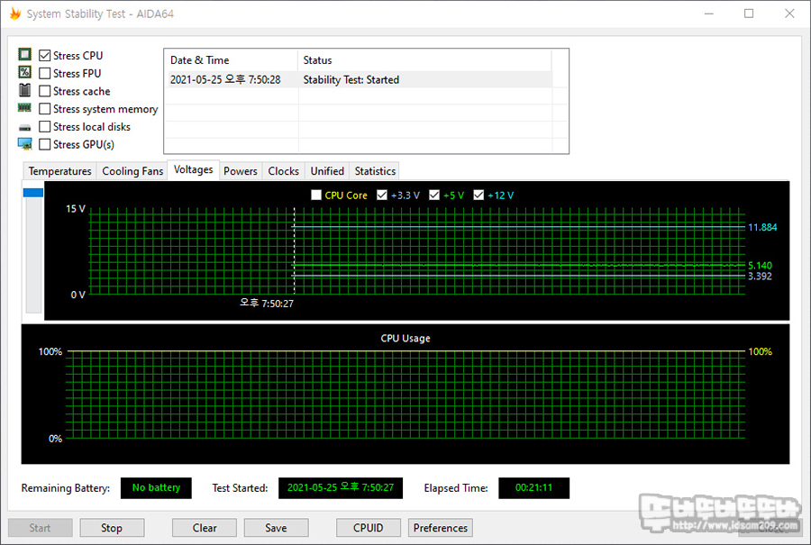파워 서플라이 전용 로드기가 없는 상태에서 개인이 테스트할 수 있는 부분이 많이 없는 관계로 OCCT와 AIDA64 프로그램을 이용한 테스트에서 안정적인 전압을 공급해주는 모습을 확인할 수 있었습니다.