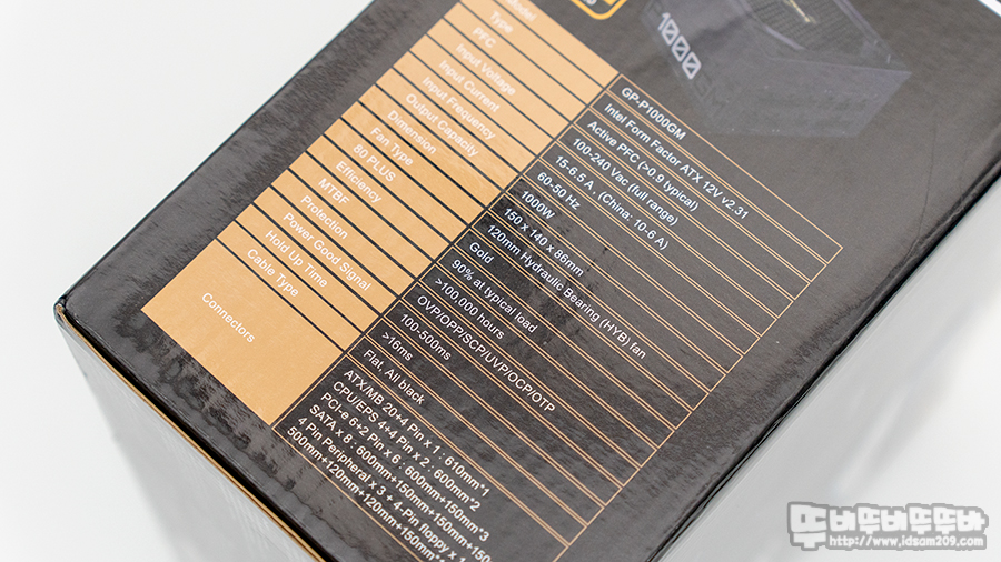 ATX 파워 / 풀 모듈러 방식 / 정격출력: 1000W / 80 PLUS Gold 인증 / +12V 싱글 레일 / 액티브 PFC / 120mm 팬 (Hydraulic 베어링, 제로팬 지원) / 보증기간 10년 / 올 플랫 케이블 / 6중 보호회로 (OVP/OPP/SCP/UVP/OCP/OTP)