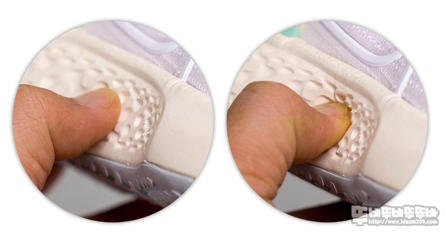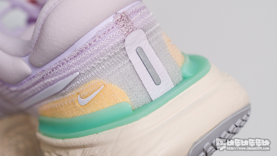 특히 뒤쪽의 두툼한 쿠션과 앞쪽의 급격한 경사로 달릴 때 발 뒤꿈치가 닿았을 때 쿠션감, 유자 형태로 구르는 유연성, 앞발의 경사로 얻어지는 매끄러운 추진력으로 편안한 지지력을 받을 수 있게 디자인되었습니다.