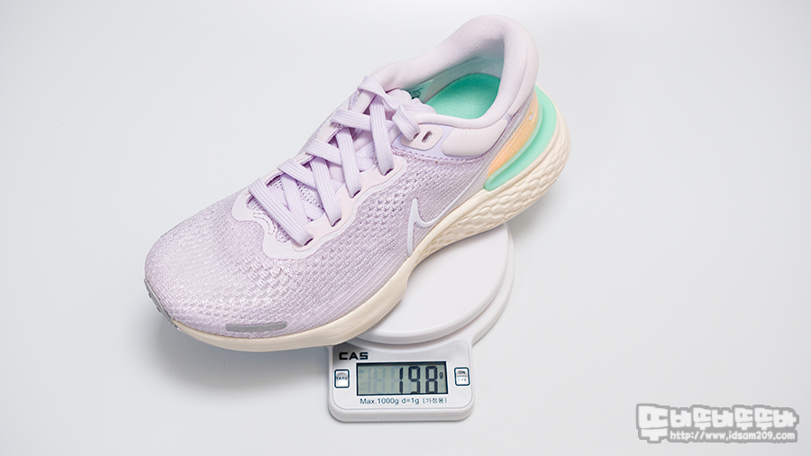 신발의 무게는 한쪽당 198g의 경량형으로 러닝에 최적화된 가벼운 무게를 보여줍니다.