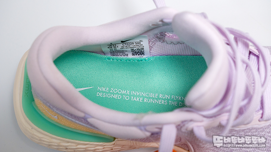 아내가 과거에 발바닥 수술을 한 이력이 있다 보니 신발을 구입할 때 쿠션감이 좋은 신발을 사곤 하는데 이번 나이키 줌X 인빈서블 런 플라이니트 (CT2229-500)는 쿠션감과 러닝에 도움을 주는 디자인으로 아내가 잠깐 착용해보고 만족스러워하네요.