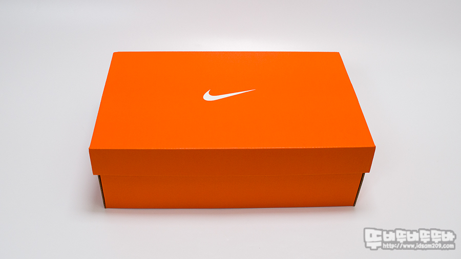 나이키의 아이덴티티를 느낄 수 있는 오렌지 컬러 박스 중앙에 나이키 로고 모습과 측면에 제품 라벨 모습입니다.