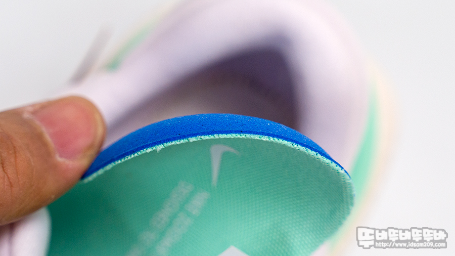 설포 부분에는 신발끈에 고정되는 부분이 없어 신발을 신을 때 설포를 손으로 고정하고 신발을 신어야 하는 불편함이 있지만 설포의 발등 부분 위치에 쿠션이 적용되어있어 러닝 시 신발끈으로부터 받는 압박을 줄여주는 역할을 합니다.