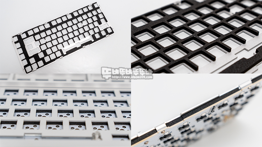 왼쪽부터 키보드 알루미늄 상판, 보강판+개스킷+기판, 바닥면 흡음재, 알루미늄 키보드 하판 모습 그리고 아래는 보강판과 기판의 분해 모습입니다.