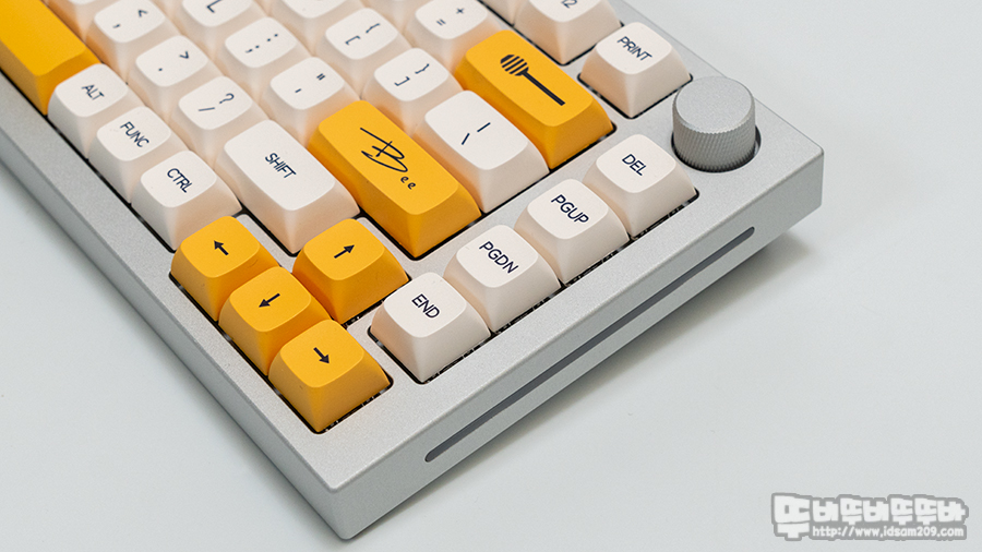 살짝 노르스름한 베이스 키캡에 옐로우 키캡의 포인트와 아기자기한 포인트 키캡이 조화를 이루는 키캡으로 스탭 스컬쳐 2가 적용되지 않은 단차가 없는 XDA 프로파일이기에 타이핑 시 적응이 필요하기도 합니다.