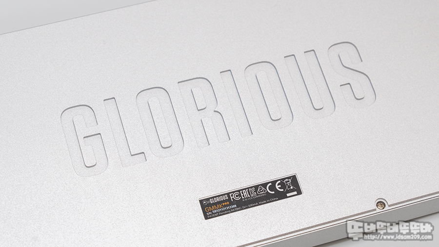 키보드 하판 모습입니다. Glorious 로고가 음각으로 각인되어있으며 양쪽 모서리 부분에 부착된 미끄럼 방지 패드와 키보드 경계면에 결합용 나사를 확인할 수 있습니다.