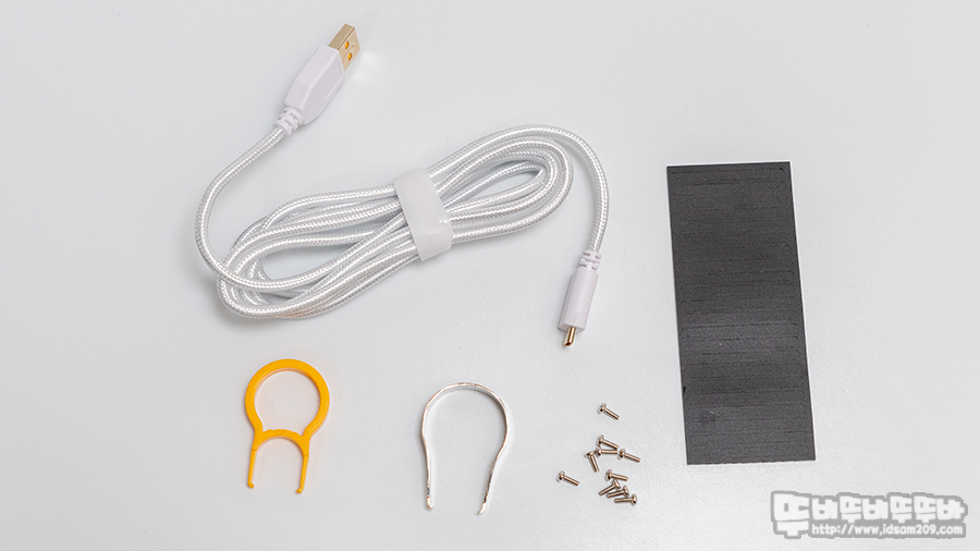 케이블은 PVC에 패브릭 소재가 사용되어 튼튼한 맛은 있지만 조금 뻣뻣한 느낌이 있으며, 키캡 리무버는 엘로우 컬러, 스위치 리무버는 스틸로 제작되어 사용 용도가 구분되니 용도에 맞게 사용하시기 바랍니다.