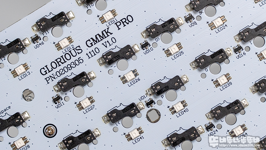 기판 뒷면에 Glorious 로고가 인쇄된 핫스왑 소켓과 SMD 타입 RGB LED 모습.