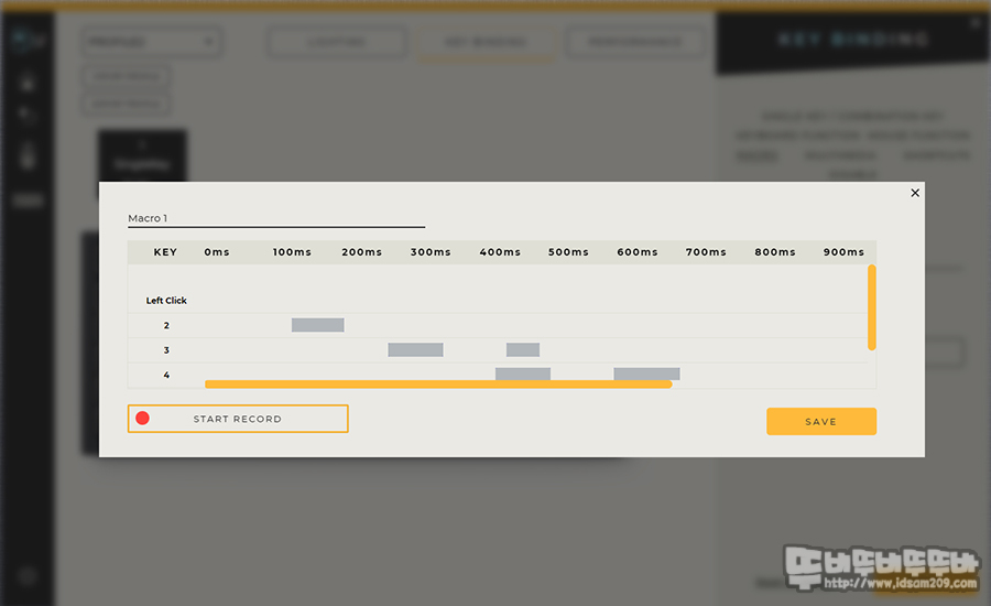 키 빌딩 메뉴는 키 스왑과 조합키 설정 / 기능 부여에서는 레이어 또는 프로파일 선택 키 설정 / 마우스 기능 설정 / 매크로 설정 / 멀티미디어 키 설정 / 프로그램 단축키 설정 등을 지원하며 키 스왑 시 1 by 1 방식으로 키 하나를 선택하고 Save를 해줘야 변경 키 하단에 언더바가 생성되어 키값이 변경됩니다.