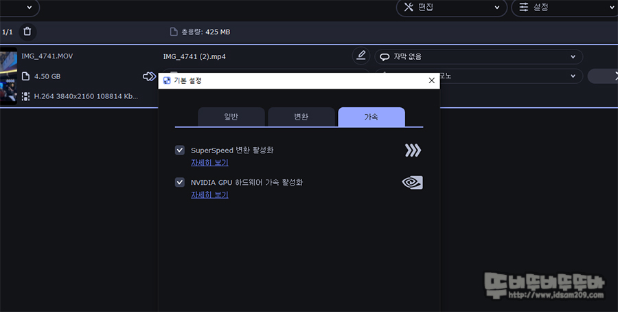 SuperSpeed 변환 활성화를 선택한 인코딩에서는 CPU 96% / GPU 11% 사용으로 4.50GB 용량의 4K 영상을 425MB 용량의 FHD 영상으로 변환 시 약 1:50초 가량 소요.