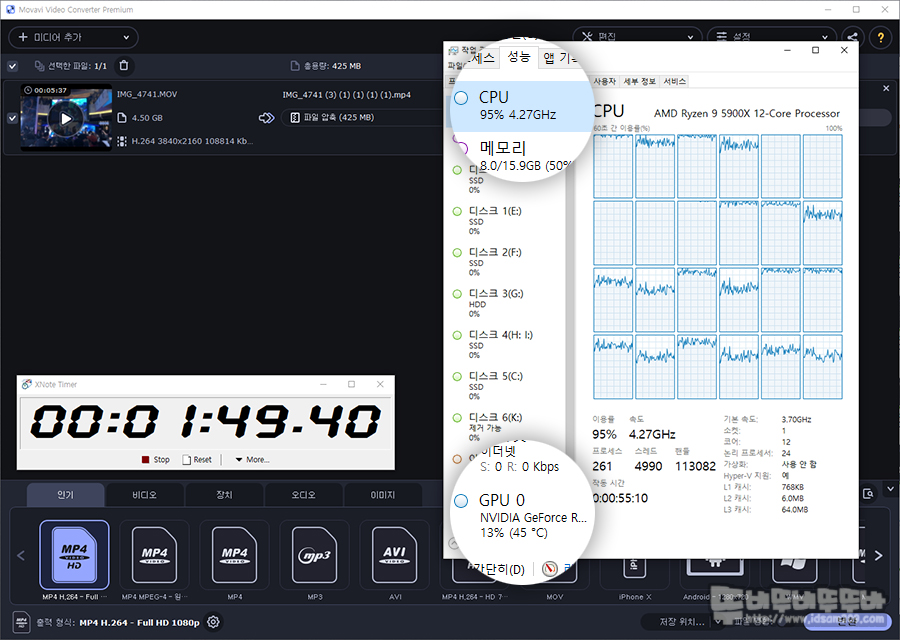 먼저 GPU 가속을 사용하지 않는 인코딩에서는 CPU 95% / GPU 13% 사용으로 4.50GB 용량의 4K 영상을 425MB 용량의 FHD 영상으로 변환 시 약 1:49초 가량 소요되었습니다.