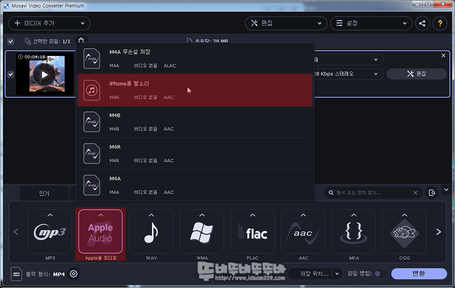 MP3 파일을 드래그하여 오디오 포맷 → Apple Audio → iPhone용 벨소리를 선택하면 MP3 파일을 간편하게 아이폰 벨소리 파일인. m4r 파일로 저장됩니다.