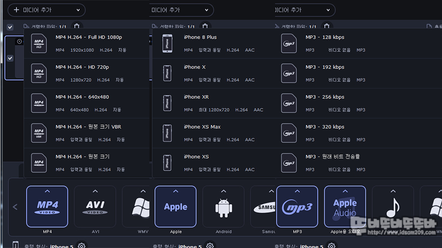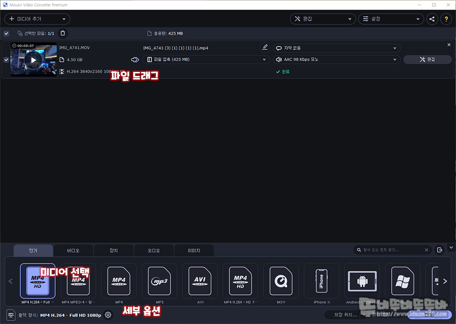 이처럼 Movavi Video Converter는 영상 또는 사운드, 이미지 등 소스파일을 드래그하여 영상 포맷, 음원 포맷, 이미지 포맷 아이콘 선택으로 간편하게 다양한 스마트 디바이스에 최적화된 소스로 만들어주는 기능을 제공하여 MOV, AVI를 MP4로 변경한다든지 MP4, MKV 영상에서 MP3, WAV로 사운드 파일 추출 등 무궁무진하게 사용할 수 있습니다.