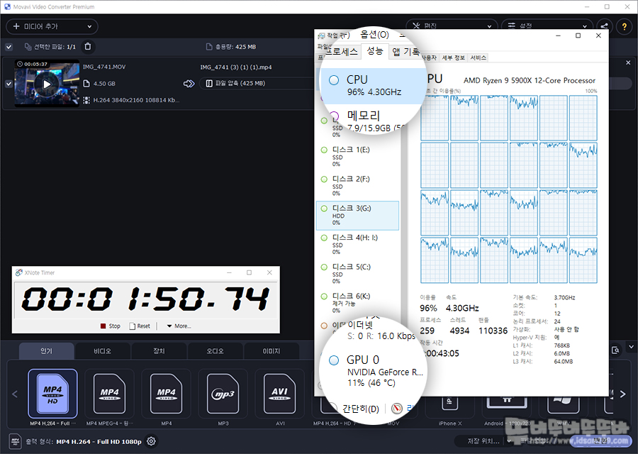 SuperSpeed 변환 활성화를 선택한 인코딩에서는 CPU 96% / GPU 11% 사용으로 4.50GB 용량의 4K 영상을 425MB 용량의 FHD 영상으로 변환 시 약 1:50초 가량 소요.