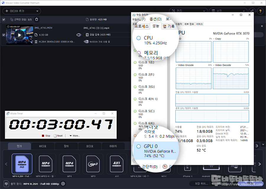 nVIDIA GPU 하드웨어 가속 활성화를 선택한 인코딩에서는 CPU 10% / GPU 74% 사용으로 4.50GB 용량의 4K 영상을 425MB 용량의 FHD 영상으로 변환 시 약 3:00초 가량 소요.