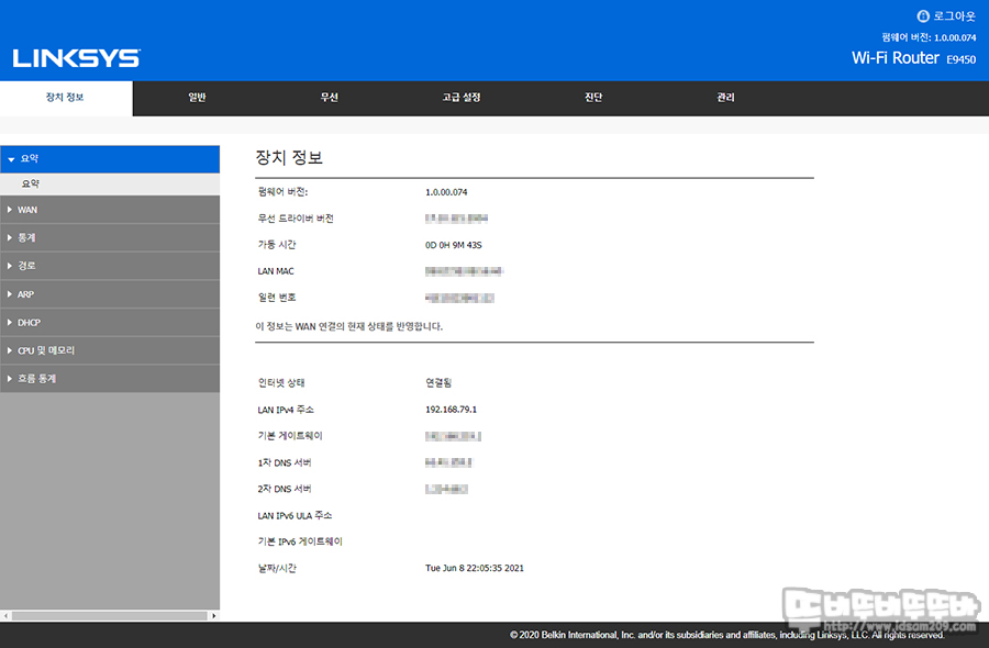 - 링크시스 E9450의 가장 기본정보인 IP, MAC 어드레스, DNS 서버 주소, 랜 포트와 와이파이에 연결된 장치 정보, 트라이 코어 프로세서 및 메모리 점유율 등 뭔가 설정하는 게 아닌 공유기의 현재 상태를 살펴볼 수 있는 메뉴인데요.