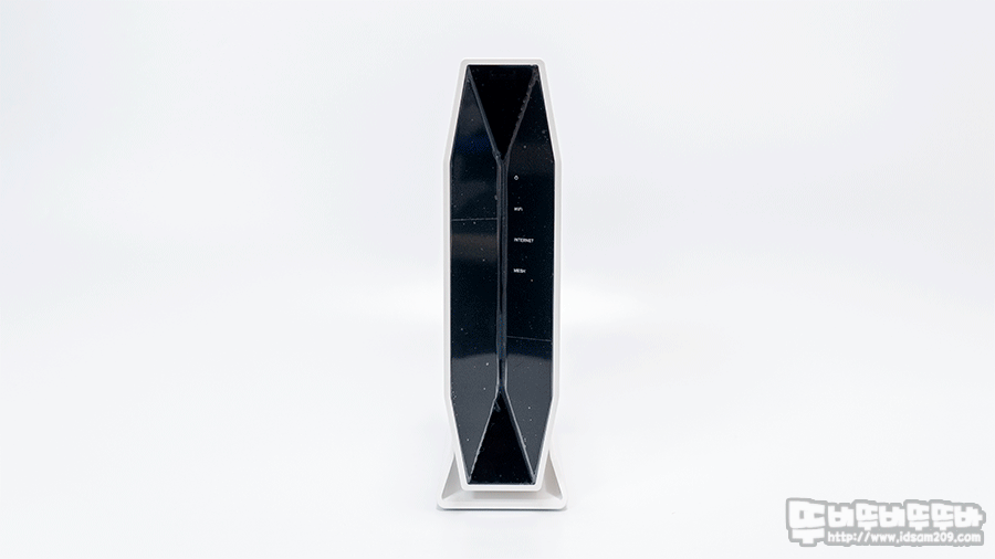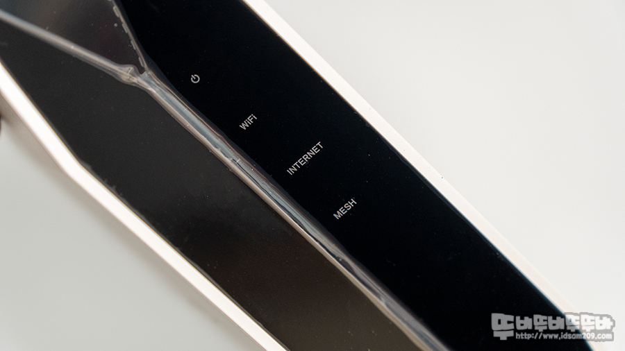 제품의 전면부에는 블랙 컬러의 제품의 상태를 나타내는 LED 인디케이터로 구성되어 있는데 특이하게도 랜 포트, USB 사용에 대한 LED 인디케이터는 지원하지 않으면 가장 기본적인 전원/와이파이/인터넷/메시 사용 상태를 알려주는 구조로 되어있습니다.