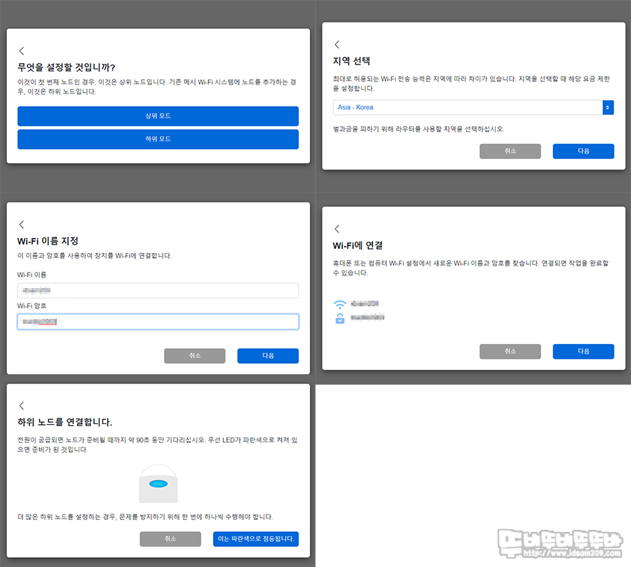 이후 진행에서 메시 설정으로 상위 노드/하위 노드 선택하는 메뉴가 등장하는데 최초 설치이기에 상위 노드를 선택 → 메시와이파이 구성 시 사용하게 될 SSID/비밀번호 입력 후 나오는 메뉴에서 하위 노드 설정을 취소합니다.