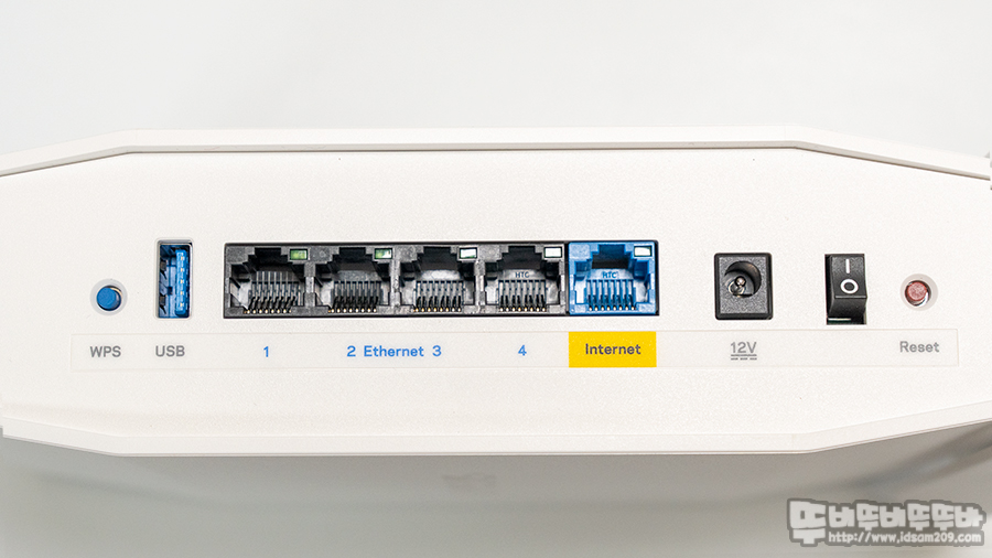 WPS 버튼 / USB 3.0 포트 (스토리지 기능 활용) / 기가비트 랜포트 4개, WAN 포트 1개 / 전원 소켓 / 전원 스위치 / 리셋 스위치로 구성되어 있으며 WPS와 리셋 스위치는 컬러로 구분하고 있으며 WAN는 블루 컬러 소켓으로 표현하고 있는 게 특징입니다.