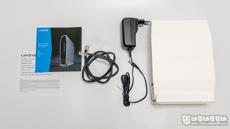 제품의 구성으로는 사용설명서, 랜 케이블, 전원 어댑터, 링크시스 E9450 본체로 구성되어 있습니다.