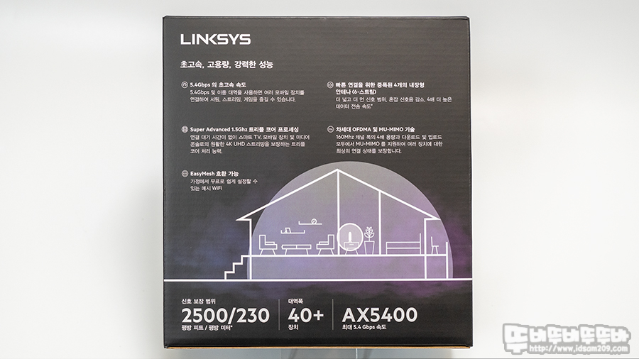 링크시스 E9450 듀얼 밴드 AX5400 와이파이6 공유기 패키지에는 제품에 대한 특징을 한글로 자세히 안내하고 있는데요.