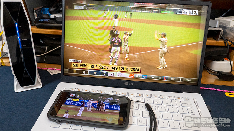 노트북과 스마트폰을 링크시스 E9450과 연결하여 메이저리그 영상과 KBO 실시간 중계를 관람하는 모습.
