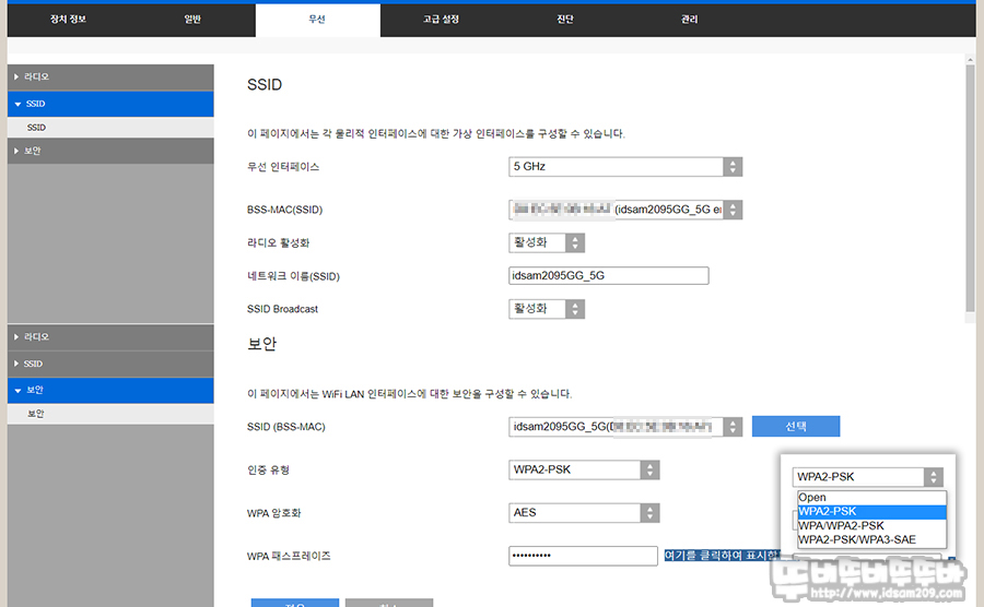 - 2.4GHz / 5GHz 무선의 채널 및 대역폭 설정, SSID 정보, SSID 보안 및 비밀번호 변경 메뉴인데요.