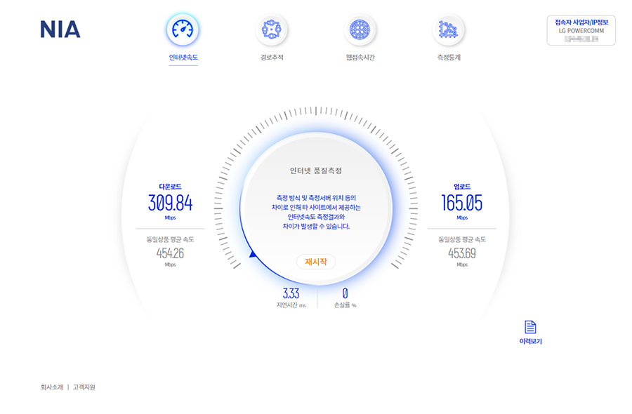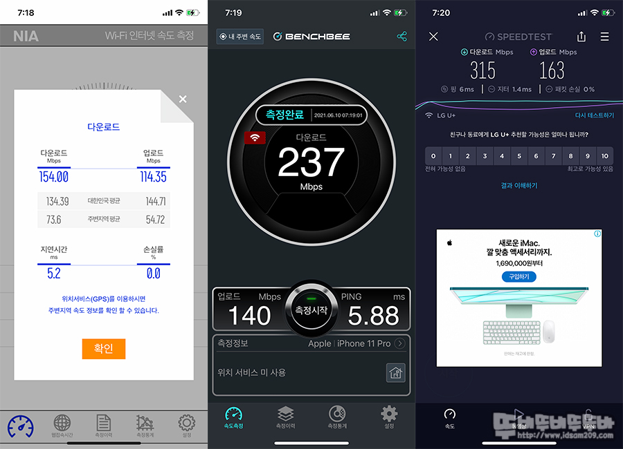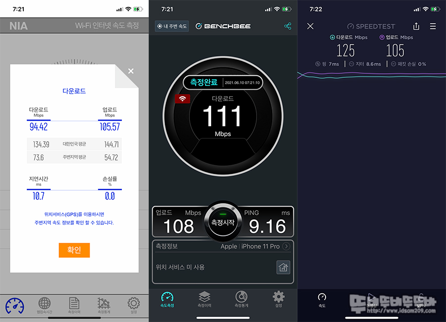 NIA, Benchbee, Speedtest 앱을 이용한 테스트에서는 앱마다 테스트를 거치는 중간서버가 다르기에 속도 측정에 편차가 있는 편입니다.
