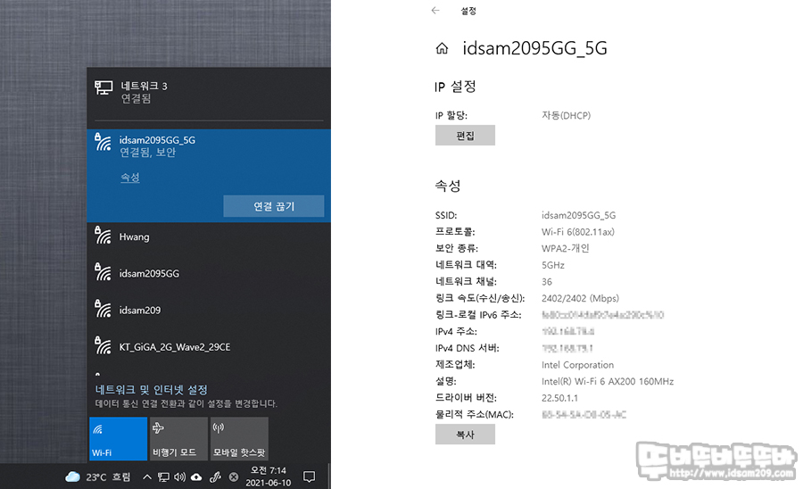 PC에 장착된 Wi-Fi AX200 160MHz 무선 아답터를 이용하여 5GHz 무선 인터넷에 연결하여 속도 테스트를 해보았습니다.