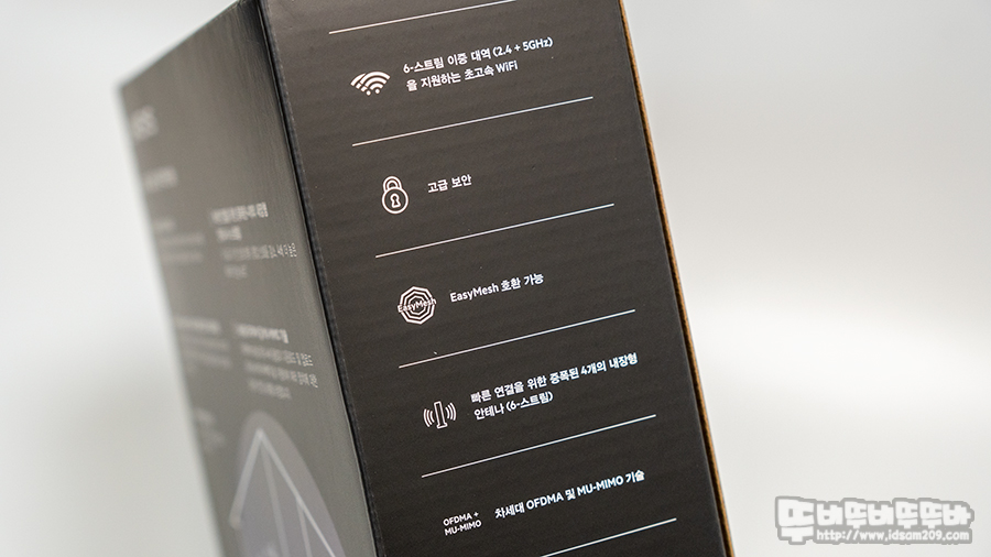 패키지 전면에는 제품의 디자인과 와이파이6(Wi-Fi 6) 지원, 최대 260 제곱미터 커버, 40개 장치 동시 접속, 통합 속도 최대 AX 5.4Gbps 지원, 그리고 메시와이파이 지원에 대한 설명을 확인할 수 있고요.