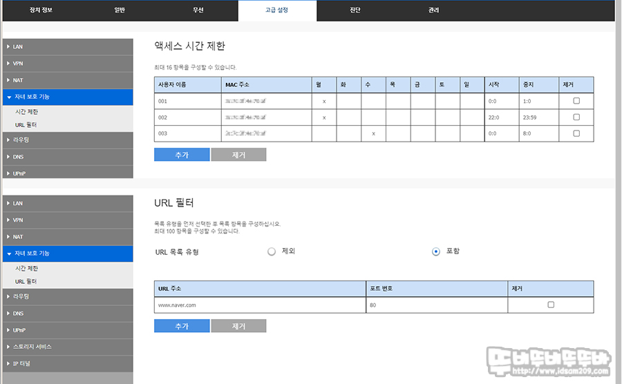 이 외 URL 주소를 이용한 필터 기능에서는 제외/포함을 선택하여 사용을 제한할 수 있으며 이외에도 포트 포워딩, VPN 설정 등 네트워크 사용에 필요한 기능을 지원하고 있습니다.