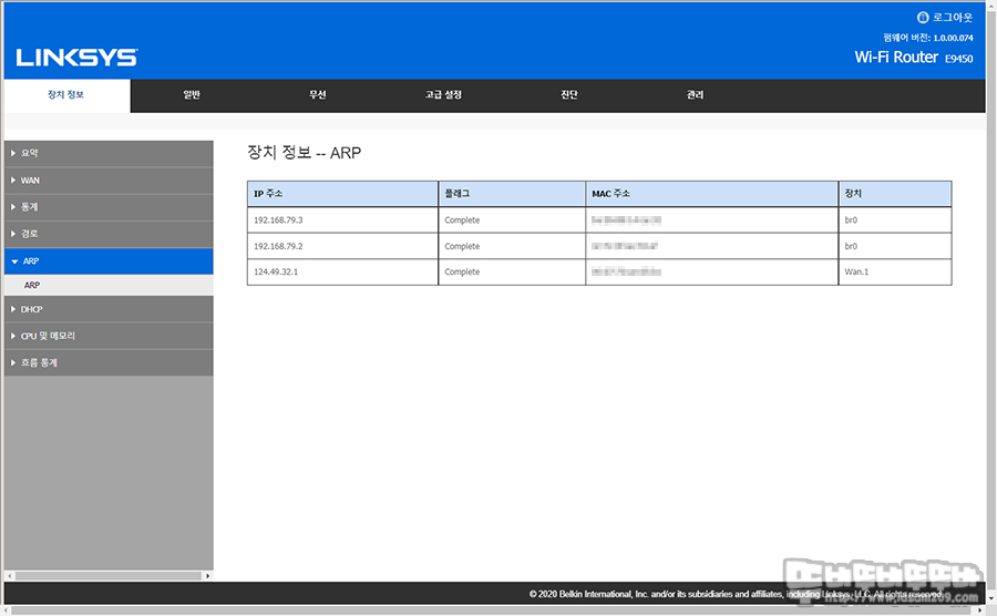 이 중에 눈여겨 봐야할 메뉴는 ARP로 공유기에 연결된 장치를 내부 IP 정보와 MAC 주소로 알려주기에 기기별 IP 정보와 MAC 정보를 알고 파악해두면 자녀보호 설정에 도움이 됩니다.