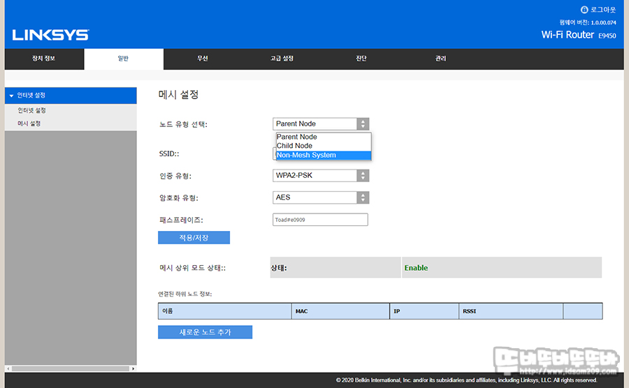 초기 설정 시 메시와이파이 구성을 상위 노드 설정만 한 상황이기에 메시와이파이 구성을 원치 않는 경우 일반 → 인터넷 설정 → 메시 설정에서 노드 유형을 non-mesh system으로 설정을 변경해주어야 합니다.