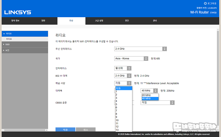 2.4GHz, 5GHz 무선 사용 시 채널 간섭이 있을 때 변경할 수 있는 채널과 대역폭 변경이 가능하며