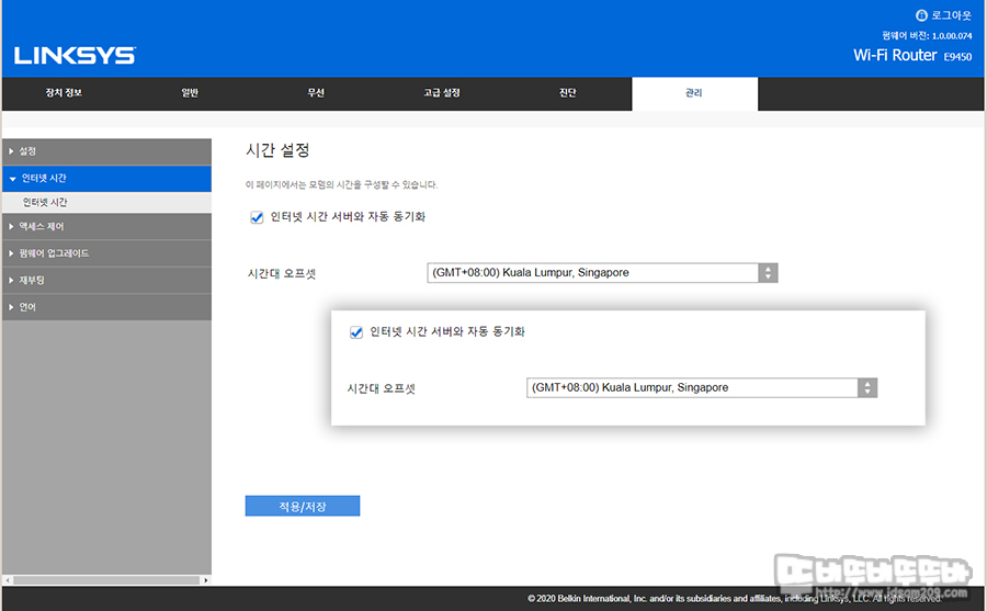 메뉴를 살펴보다 관리 → 인터넷 시간의 기본값이 싱가포르로 되어있는 것을 확인할 수 있는데 제품을 사용하시게 된다면 서울로 시간을 변경해주시기 바랍니다.