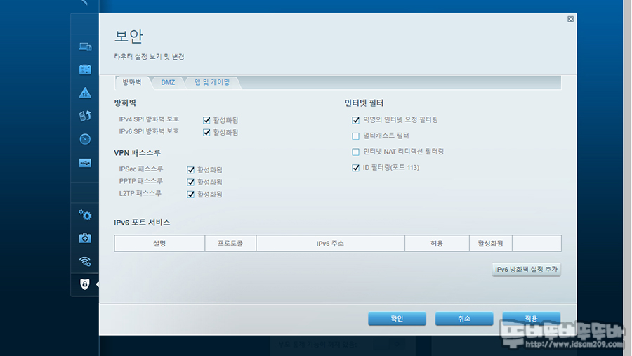 보안 메뉴에서는 방화벽, DMZ, 포트 포워딩 등 전체적인 보안 관련 설정을 지원합니다.