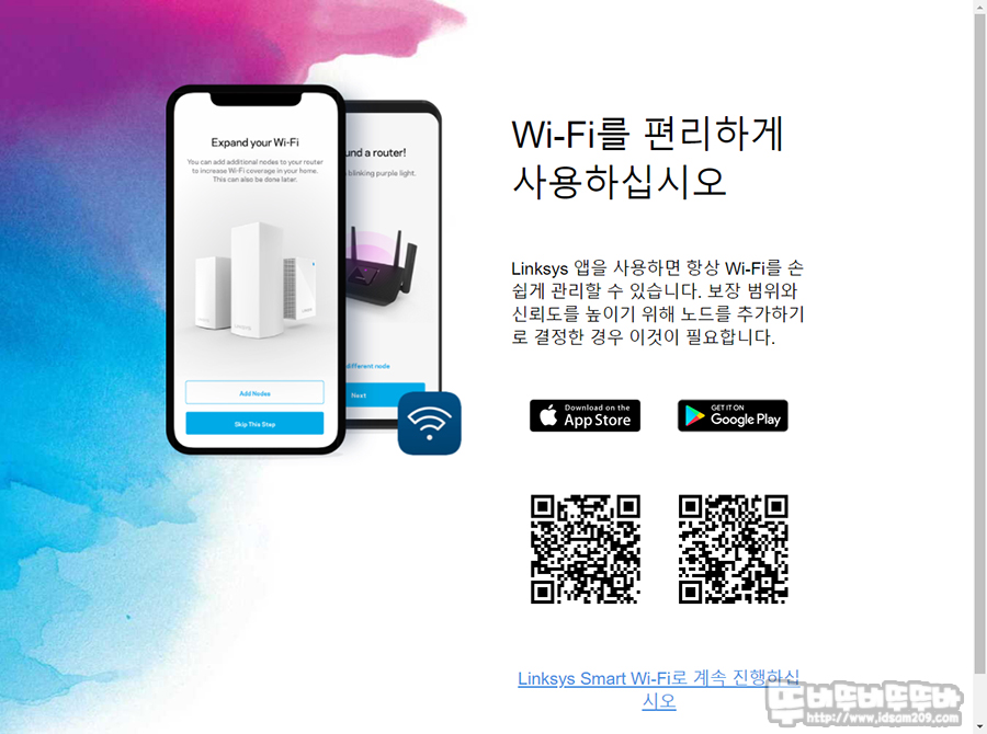 링크시스 앱을 이용한 설정도 가능한 제품이기에 초기 메뉴에서는 IOS 또는 안드로이드 앱스토어로 연결해주는 QR코드를 제공하고 있으니 스마트폰 앱으로 설치 시 참고하시고요.