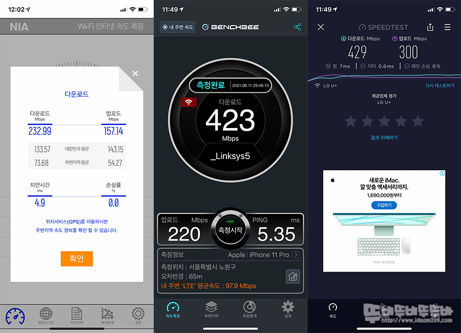 아이폰을 이용하여 링크시스 MR7350 5GHz에 접속하여 속도를 체크해보면 체크하는 프로그램에 따라 편차가 있지만, 꽤 빠른 속도를 보여주고 있습니다.