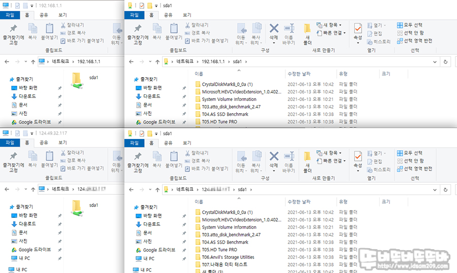내부 네트워크상에서는 \\192.168.1.1 주소로 설정한 이름과 암호 입력으로 접속이 가능하며 외부 네트워크 주소를 이용 시 외부에서도 동일한 방식으로 접속이 가능하여 파일의 복사와 삭제가 가능합니다.