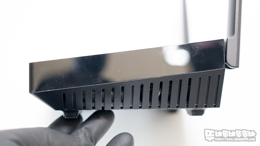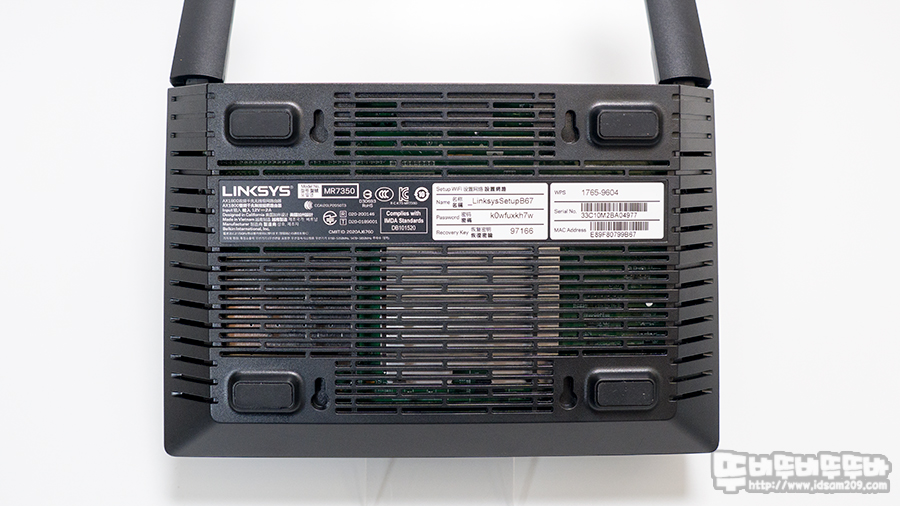 컴팩트한 사이즈로 디자인된 링크시스 MR7350 공유기의 상판과 하판에는 공기 흐름 원활하게 하는 타공 디자인이 적용되어 내부 발열을 효과적으로 배출하며, 바닥면에는 미끄럼 방지 패드와 벽걸이 홀 그리고 초기 설치에 필요한 정보가 인쇄된 라벨 정보를 확인할 수 있습니다.