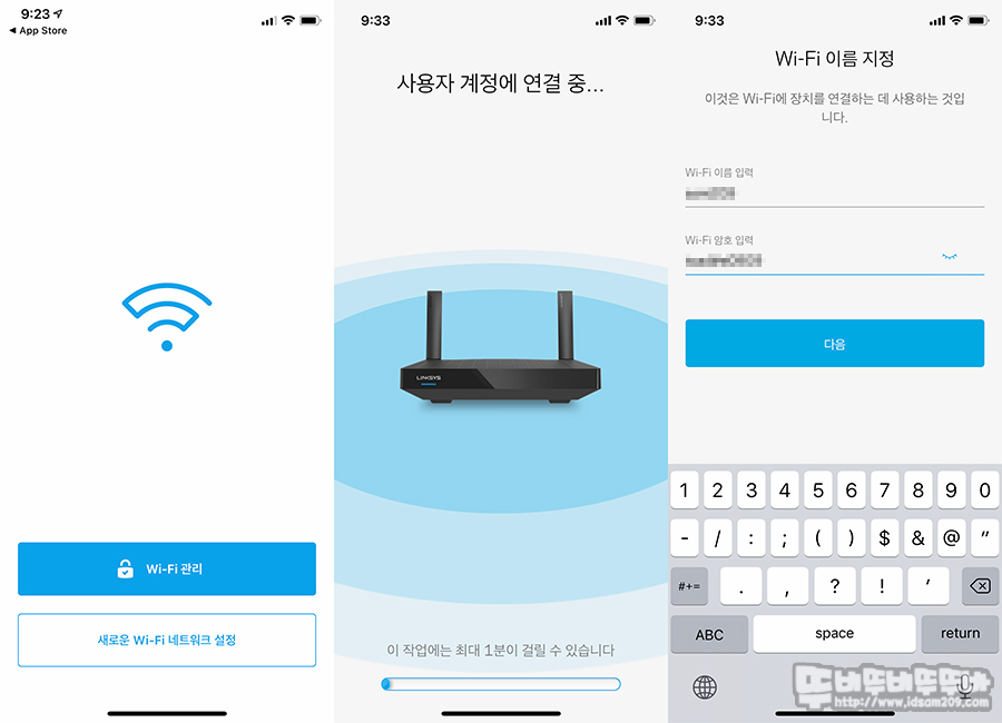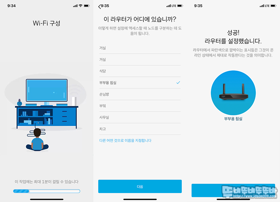 링크시스 MR7350 Wi-Fi에 접속 후 앱 스토어에서 "Linksys" 앱을 다운로드 후 실행 시 세팅을 진행하면 Wi-Fi SSID와 암호 설정 후 Wi-Fi 구성과 설치 장소 선택을 거쳐 세팅을 완료하게 됩니다.